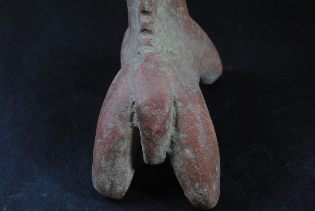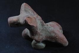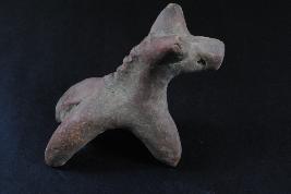It is horse figurine made of terracotta. It has pinned eyes and pinched mouth. Its one fore leg is missing. It is well fired and color is red. The object loosing its natural color. There are some cut line on its mane. It may be used as a toy. It has some fine red slip covered.
