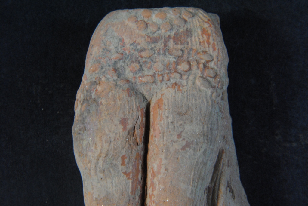 It is a human leg made of terracotta. It is well fired and color is red. It has some dotted design on it surface. Its bottom and upper parts are missing. It has some incised design on it. It may be used as a toy. The object losing its natural color.