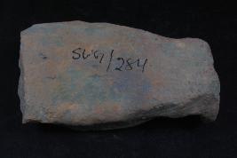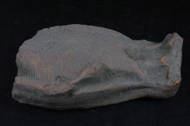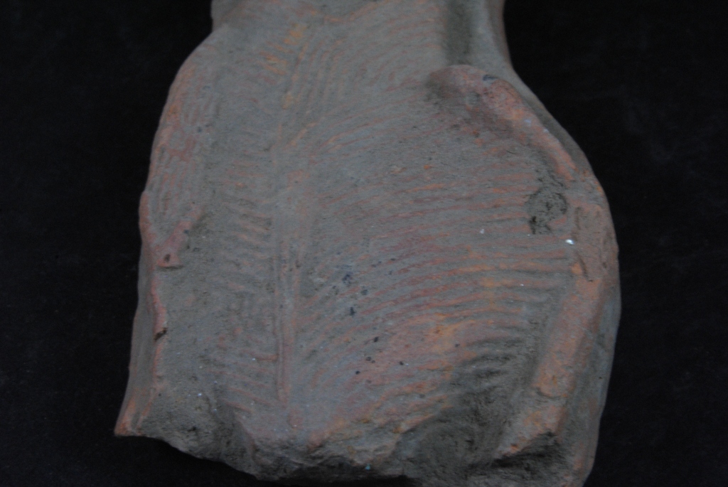It is a female figurine made of terracotta. It is well fired and its colors is red. Its upper part is missing. It has wearing a grovery. There are some incised design on its clothes. It has a holding a flower in her right hand. The object losing its natural color. Surface is rough and flaked.