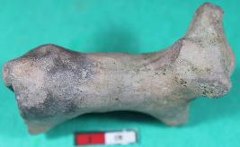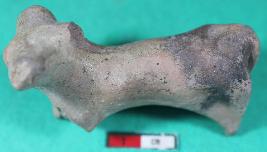 | Description / विवरण | Damaged humped bull with prominent broken horns, tail and joined legs are showing having rough surface. |