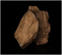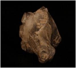 | Description / विवरण | Terracotta fragment of elephant head with embossed design on the tusk, circular incised eyes and grey in colour. |