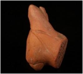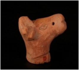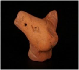 | Description / विवरण | Terracotta animal head with prominent ears, lozenged shaped eyes, perforation on the snout and red in colour. |