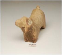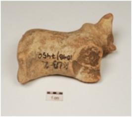 | Description / विवरण | Terracotta bull figurine with partly broken face, conical horn, projected tail, joined legs and chocolate slipped. |