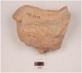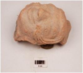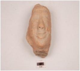| Description / विवरण | A terracotta human head, fan shaped headdress, applique dimond shape eyes, intact nose and mouth, lower portion is missing, rest on cylindrical base in back. |