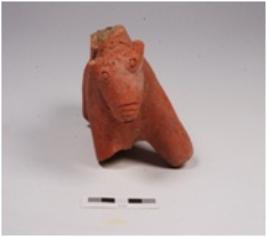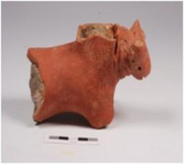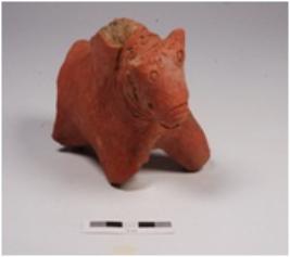| Description / विवरण | A handmade terracotta bull figurine with a broken hump and legs, left fore leg intact, applique decorations on the neck, incised facial features indicating circular shaped eyes, perforated nose and prominent lips, surface treated with red slip, made with fine clay and well baked restored. |