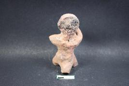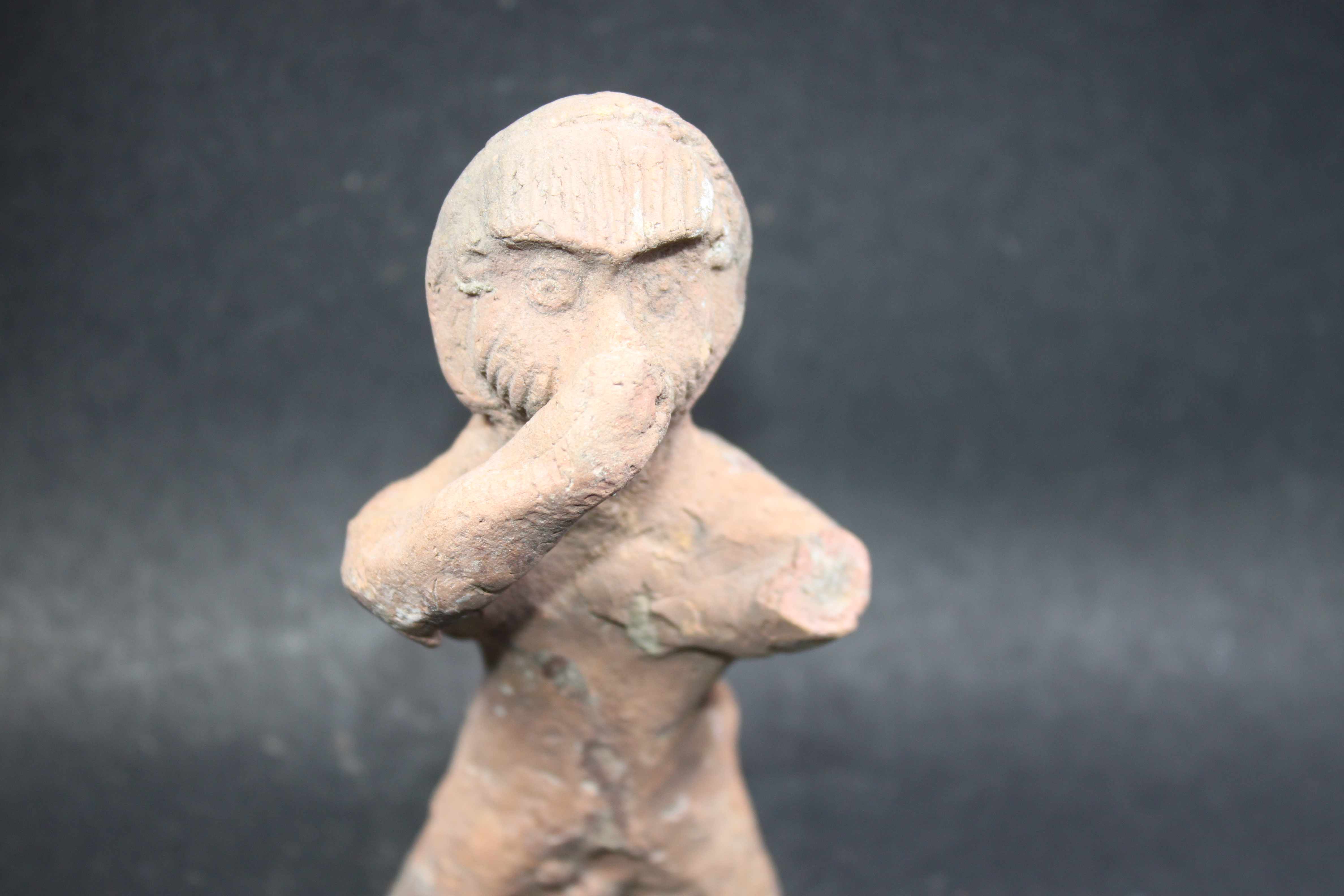 An animal figurine probably a monkey with prominent mouth,applique eyes and incised lines on its face. It has rough surface.