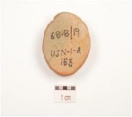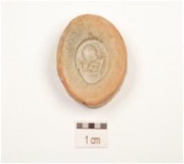 | Description / विवरण | Terracotta circular coin mould roman head impression on surface. |