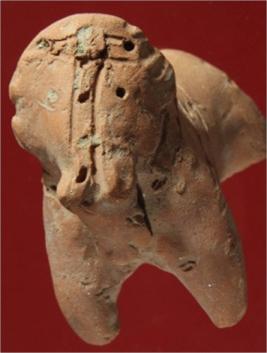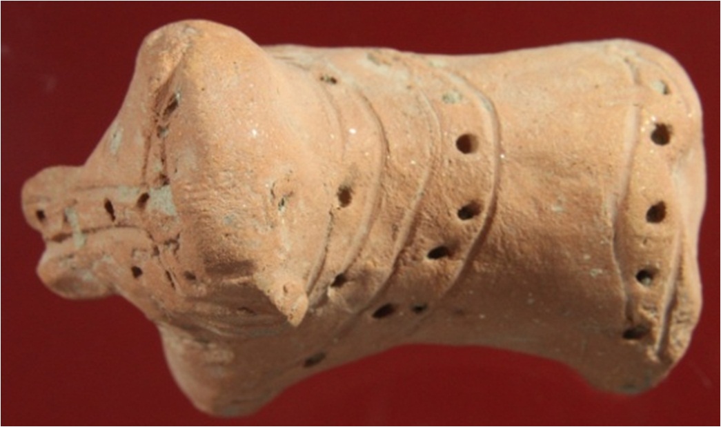 It is a bull figurine made of terracotta. One leg is lost and hump is visible. Dotted design on the surface. Surface is rough and colour is brick brown.