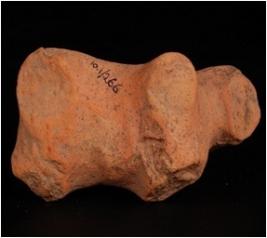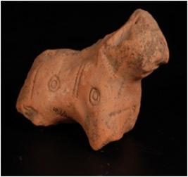 | Description / विवरण | A terracotta bull figurine with a broken hump. Made of well levigated clay, hand modelled and well baked. It has circular designs and incised pin hole marks on the body. Legs are broken, tail intact, covered with red slip. |