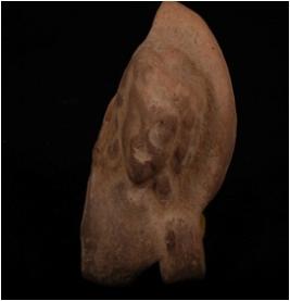 | Description / विवरण | handmade head of a male figurine with a circular holo rising from shoulders, curly hair on top falling in locks, wearing earings and necklece, made wuith well levigated clay, well baked, surface treated with buff wash. |