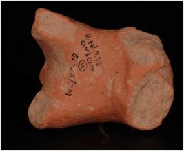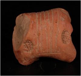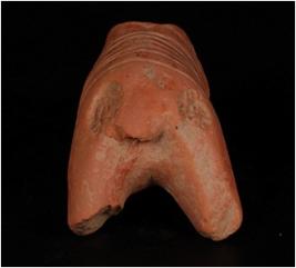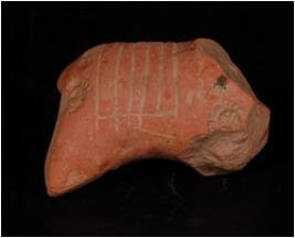 | Description / विवरण | Handmade terracotta fragment of animal with grooved and embosed circular design on body. Headless, fore legs are missing, hind legs are little dameged, red in colour. |