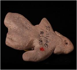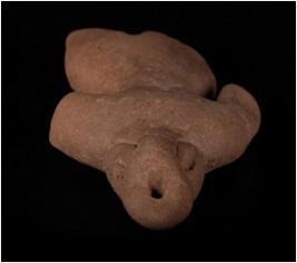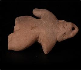 | Description / विवरण | Handmade terracotta goat headed male figurine, intacted head and pierced. Ears are visible, right hand is intacted and left one is missing. Legs are missing, cruded, lean body. |