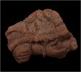 | Description / विवरण | Terracotta moulded fragment of lord vishnu image showing right hand. Upper hand holding a bowl while lower hand placed on the top of mace. Lower hand wearing bracelet , stylized finger and robe is hanging around hand. Ill baked,gritty clay and dull red in colour. |