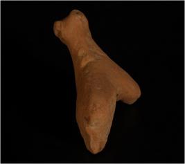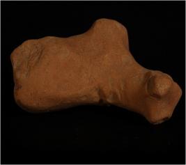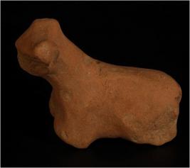 | Description / विवरण | Terracotta handmade animal figurine with pinched eyes and nose. Conical face. Intact right leg. Ill fired, well levigated clay and dull red in colour. |