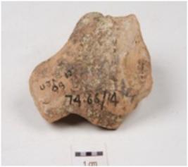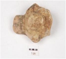 | Description / विवरण | A mould made terracotta female head, wearing a headdress at the top, ornamented ears, prominent sharp nose and slit mouth. |