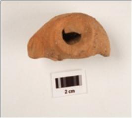 | Description / विवरण | A terracotta male bust, hollow inside and partly visible arms. |