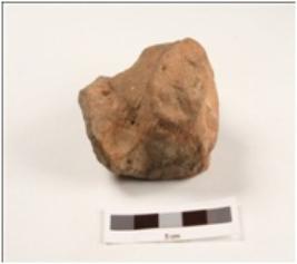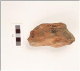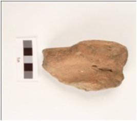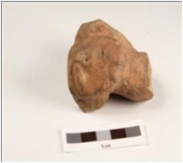 | Description / विवरण | A fragment of terracotta human head, head is visible with embossed angular eyes and incised mouth. |