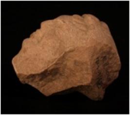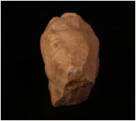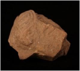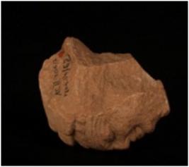 | Description / विवरण | Fragment of a male head, smiling face almound eyes, long ears, headdress is shown by incised lines face is partly broken from left. |