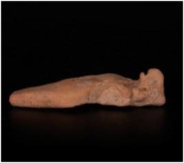 | Description / विवरण | Mould made terracotta represents a human figurine. It has narrow waist, pinched face, slit mouth, elongated ears with incised line. |