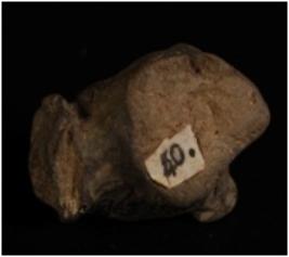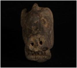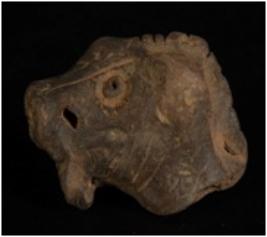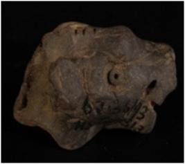 | Description / विवरण | Terracotta fragment of an unfinished lion head in dark grey fabric. Round pin hole eyes and Pierced snout. |
