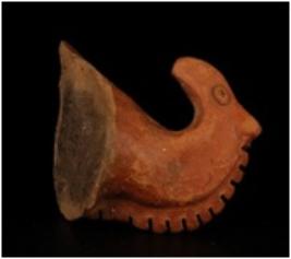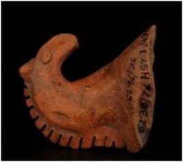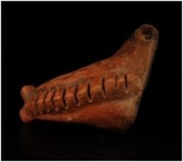 | Description / विवरण | Terracotta head of stylized horse figurine. Applique pellet eyes and Conical mouth and indented manes. |