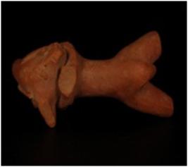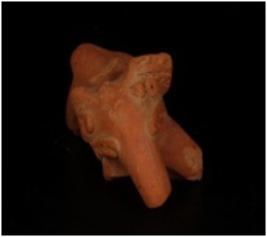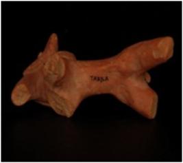 | Description / विवरण | Terracotta elephant figurine trunk is visible but partly broken. Tusks are visible , but left one is broken. Legs and tail is intact. Applique decoration on forhead indicating garland |