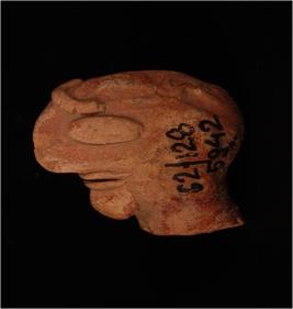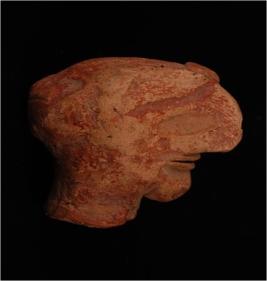 | Description / विवरण | Hand-made terracotta fragment of a human figurine, fragment of a head band on the forehead suggest a head dress for the figurine, the facial features have been depicted by oval shaped eyes, right eye missing and a sharp pinched nose. A silt below the nose suggest the mouth, prominent chin and applique method has been used for the head band, eyes and lips. |