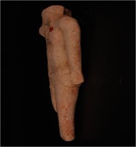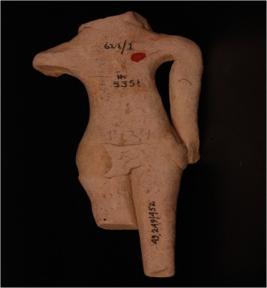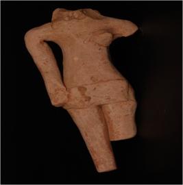 | Description / विवरण | Hand-made terracotta female figurine in a standing posture with its hands running parallel to the body resting at the hip and legs joined together, the head is completely missing, the left hand is broken from the shoulder, the left leg is broken from the knee and the right leg is lost from the ankle below. conical breasts, attached by applique and flat rectangular girdle is attached by applique around the waist. |