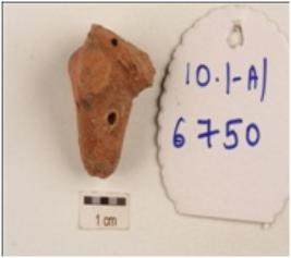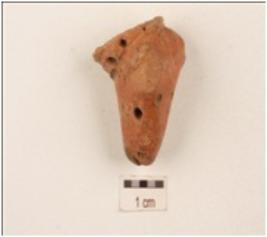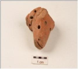 | Description / विवरण | Handmade terracotta fragment of animal figurine with perforation on the snout, pin holes on the neck, well baked, fine fabric, surface treated with red slip. |