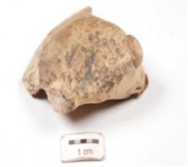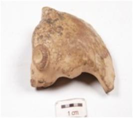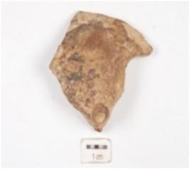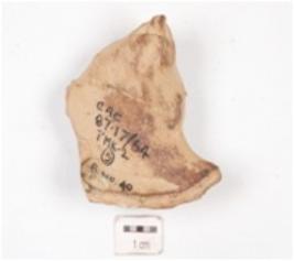 | Description / विवरण | Fragment of a handmade terracotta snake hood with applique circular mani on top, dotted nostrils, split mouth, applique tongue continues till nostrils, body missing and dull red slipped. |
