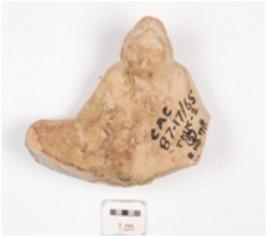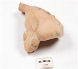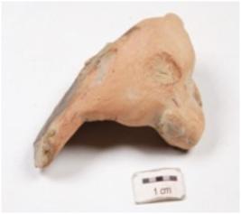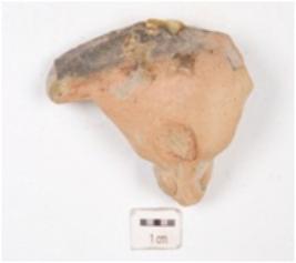 | Description / विवरण | Fragment of a handmade terracotta snake hood, impression of applique mani kept on top of hood, projected head with applique circular eyes, dotted nostrils and split mouth. |