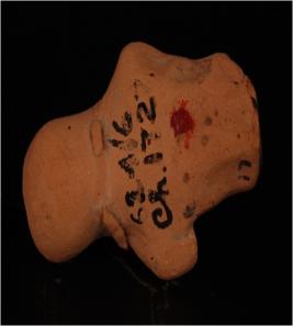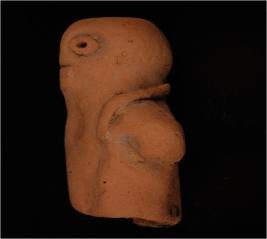 | Description / विवरण | Handmade terracotta human figurine with a prominent bun shaped headgear. The portion below the torso completely missing, nose pinched out, oval pellet eyes with a pin hole attached by applique and the mouth marked with an incised line, Fragments of a necklace, attached by applique, present around the neck. |
