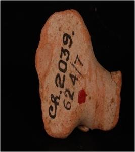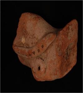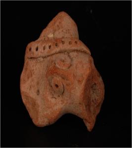 | Description / विवरण | Handmade terracotta fragment of a human figurine. The portion below the neck is completely lost. The head has been distinctly crafted with a fan-shaped headgear. A wide-band, decorated with pin-hole marks, is attached around the base of the headgear extended on the left. The headgear s partially destorted from the right. The nose has been pinched out and round pellet eyes with pin-hole. |