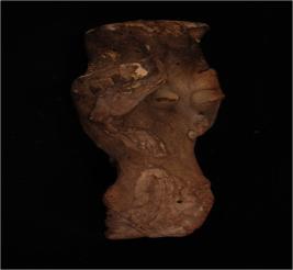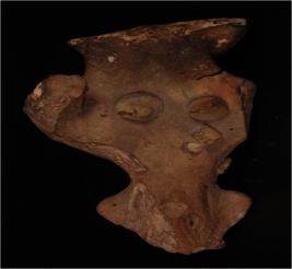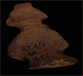 | Description / विवरण | Handmade, terracotta female figurine with a prominent fan-shaped headgear. The portion below the torso is completely lost, the right hand is broken from the shoulder, the left arm is missing from the arm, the face and the shoulder, is partially destorted. The nose has been pinched out. The eyes are designed by round pellets eyes. |