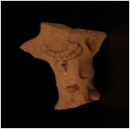 | Description / विवरण | Handmade terracotta human figurine. The head and hands are broken, neck is adorned with two necklaces made by appliqu method and consists of pierced hole design. The fragment of necklaces with pendants are present on the chest portion. |