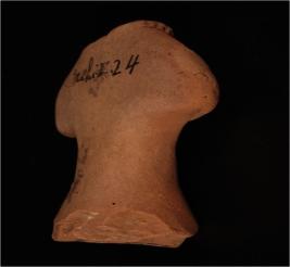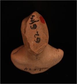 | Description / विवरण | Hand made headless female figurine with round shaped pedestal. Hands are in akimbo position but the left hand is broken. Lower portion below the waist is missing. Neck portion is adorned with necklace having number of pierced holes.Fingers of right hand are marked with incised lines.Traces of breasts are visible.Necklace is fixed by applique method. |