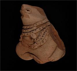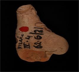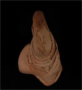 | Description / विवरण | Hand made terracotta male human figurine with bun shaped head-dress which is partly broken. Neck portion is adorned with five necklaces with a design consisting of pierced holes. Among them one necklace is attached with a pendant. The left hand is partly broken and the lower part is missing below the bust part of figurine. |