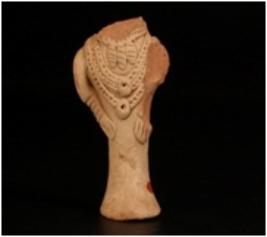 | Description / विवरण | Handmade, terracotta human figurine in akimbo position, placed on a cylindrical pedestal. It is adorned with four necklaces designed with pierced holes and they were made by applique method. |