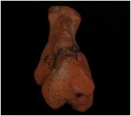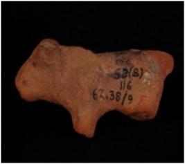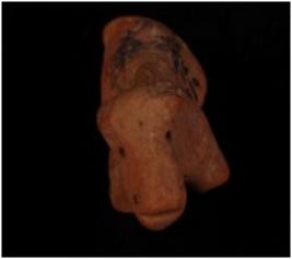 | Description / विवरण | Handmade terracotta dog figure, ears and legs are broken. Traces of slip in red colour. Eyes were shown as pierced holes, The nostrils are indicated by pinhole and mouth is slit. |