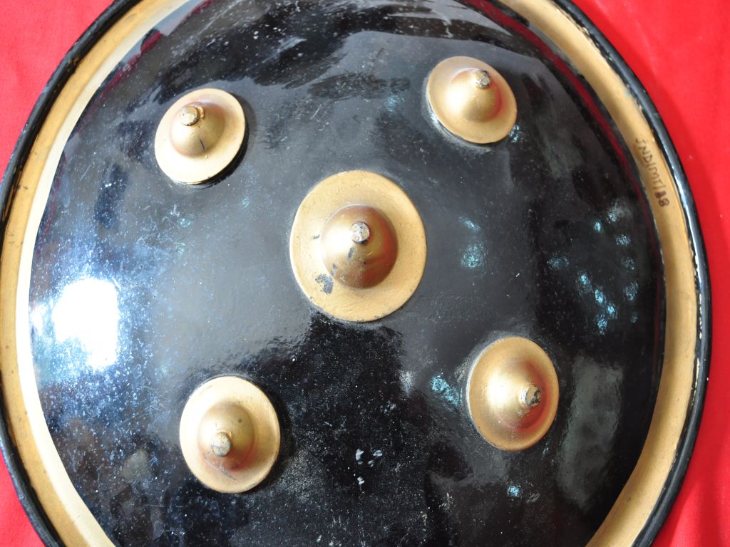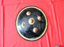 It is a dhal made of iron and bronze.It may used in war for the protection of solider.Its round shape.It has some design on it surface and bottom has handle to hold it.