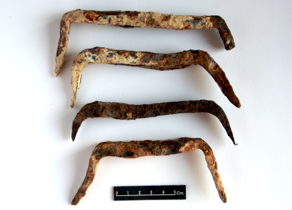 There are four iron clamps with damaged ends. These are used for joining two separate stone blocks, surface is completely rusticated. Four specimen of the clamps are placed horizontally; all of them are rusticated.