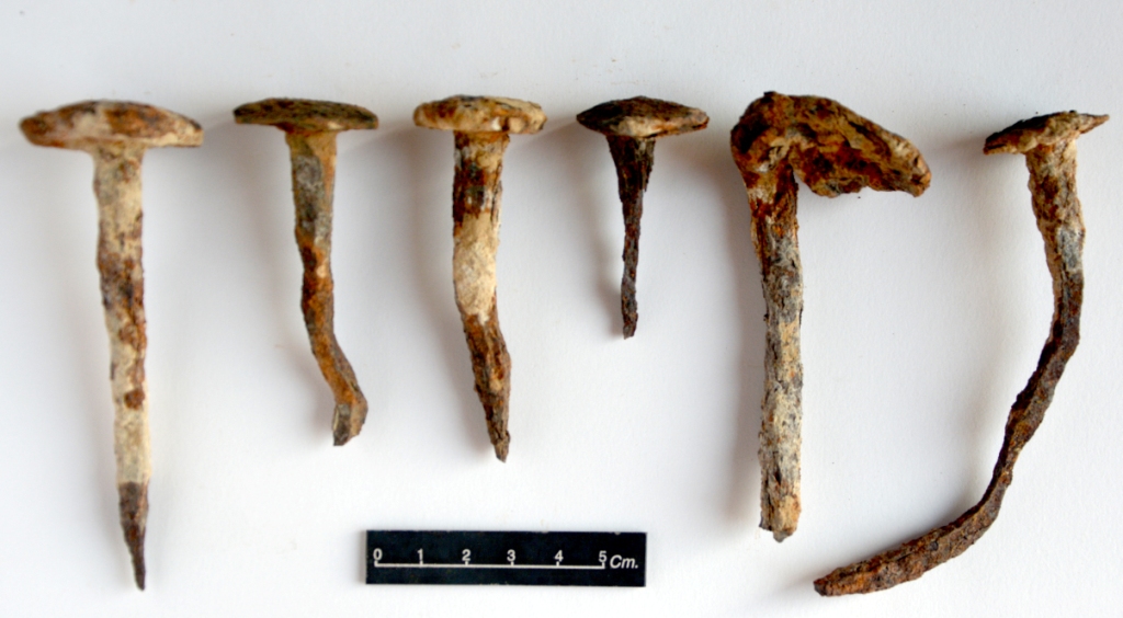 Six specimen of iron nail with circular top. some of the nails have broken lower body. Surface of the object is completely rusticated.