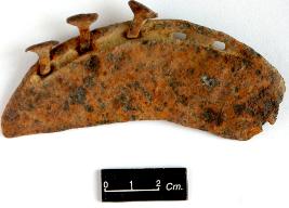 Its a fragment of an iron horseshoe with five holes having nails nail in three of them. Ends of the object is broken . Surface of the object is completely rusticated.