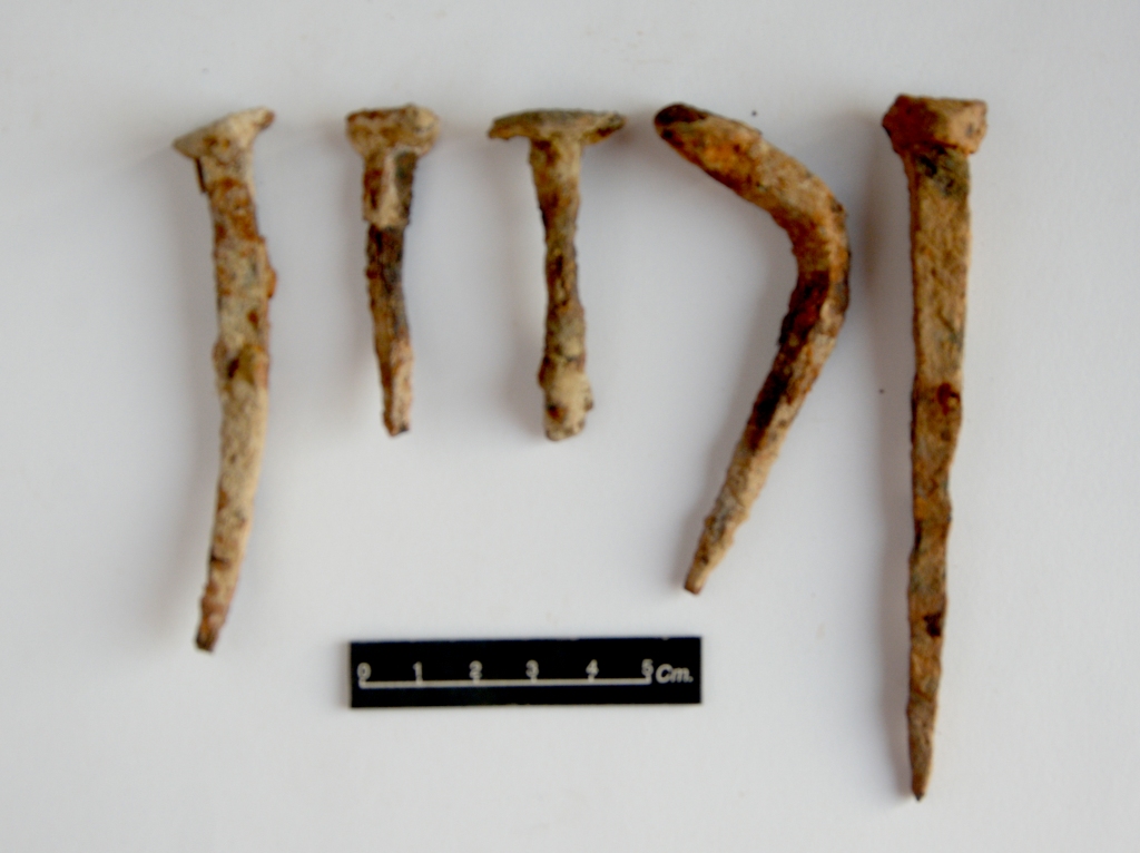 These are five specimen of iron nail having pointed functional end, placed vertically parallel to each other.Top of the nail is round in shape. One of the nail has its top broken with lower body bend. Surface of all the objects are rusticated.
