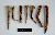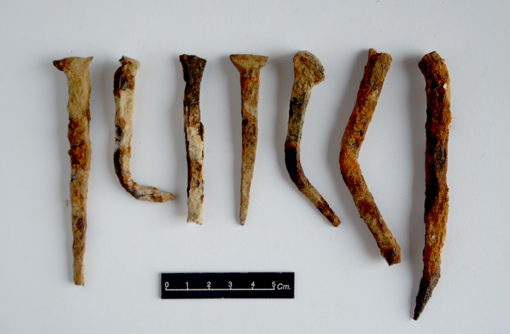 There are seven specimen of iron nail having pointed functional end, extended horizontally to one side. Surface is rusted. Top of the nail is broken Third number nail is top is more broken. Three nail had been bent. All nail are rusted.