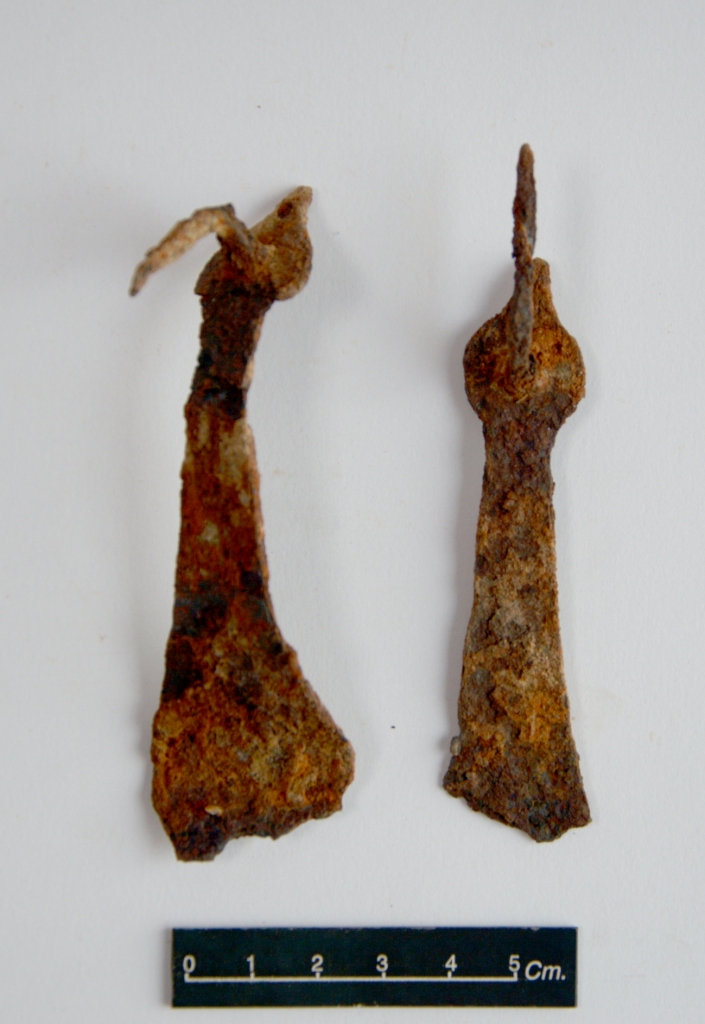 There are two fragments of unidentified iron object probably part of a door handle. Surface of the objects are completely rusticated. Upper part of the object is slightly curved with an angled nail attached to it.