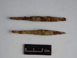 Two arrowheads with one of them having damaged end. Surface of the object is rusticated and chipping of the metal can also be observed at places.