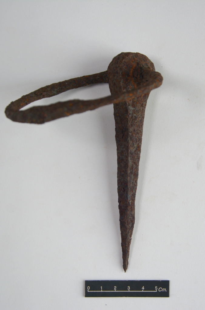 It is a Door knocker ring made up of iron. The attached nail surface is rusticated and its edge is sharp. Ring is attached to the nail through a hole which is made on the top of the nail. Surface of the object is rusticated.
