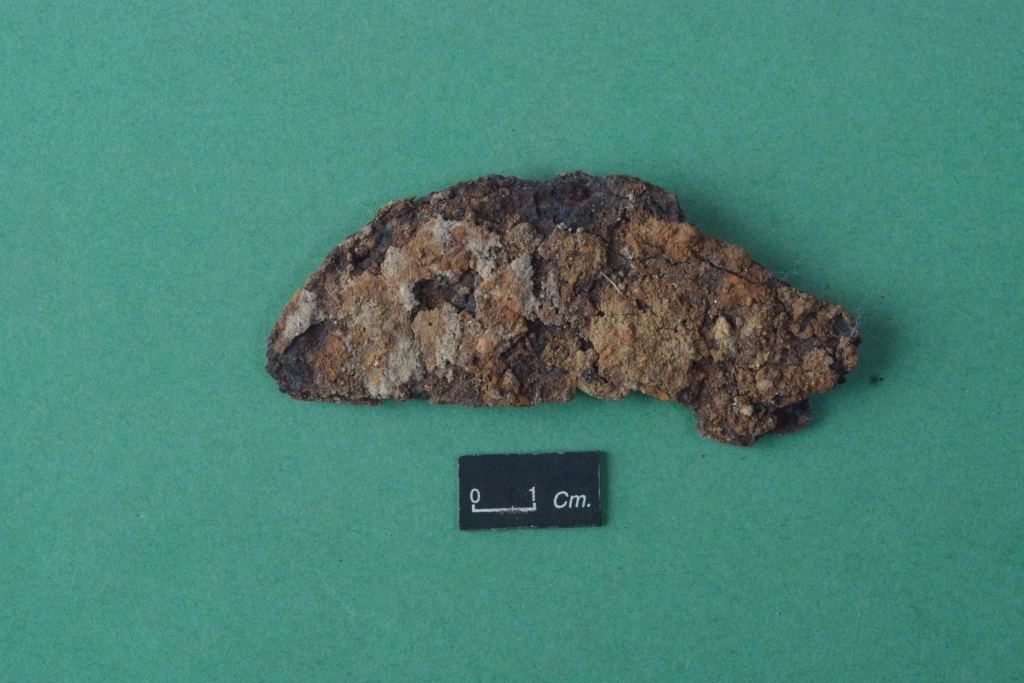 Fragment of iron sickle designed with curved blade typically hand-held agricultural tool it might be used for harvesting and other agricultural purpose.