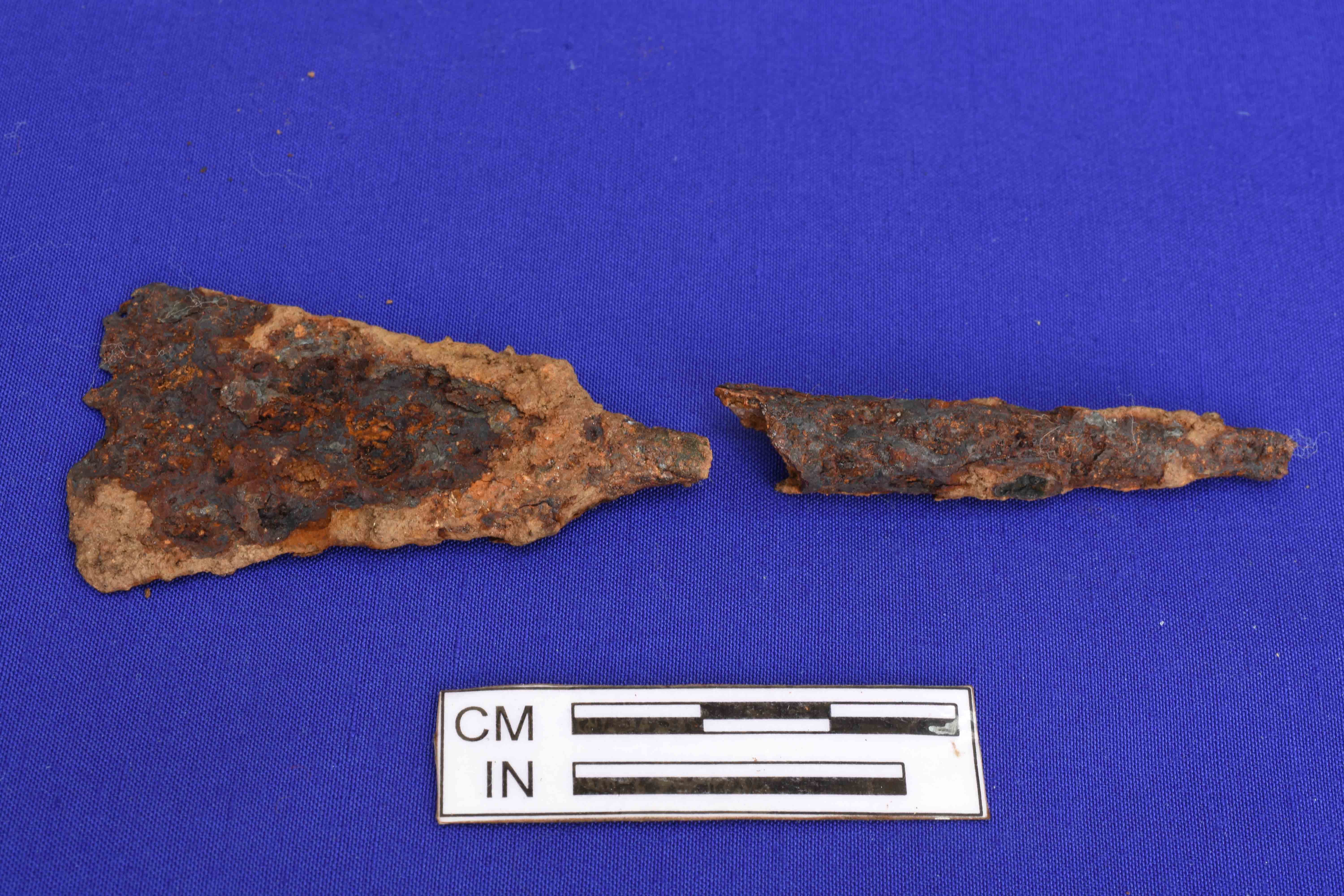 A Iron chisel broken in two parts with wide working end and long handle.